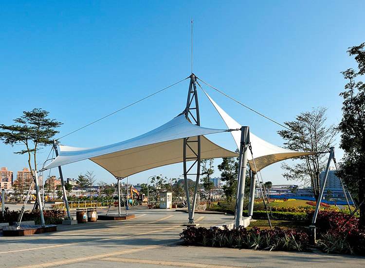 戶外膜結(jié)構(gòu)小品是景觀中的點睛之筆,一般體量較小、色彩單純,對空間起點綴作用。小品既具有實用功能,又具有精神功能。戶外膜結(jié)構(gòu)小品的出現(xiàn),提高了整個空間環(huán)境的藝術品質(zhì),改善了城市環(huán)境的景觀形象,給人們帶來美的享受。