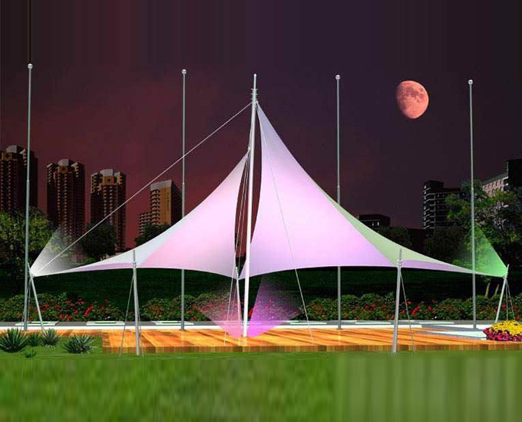由于膜材料本身應(yīng)有的顯色性,在夜間彩燈的映射下能形成絢麗繽紛的景觀,不僅為人們提供遮陽避雨的空間。同時(shí),更由于這種生動(dòng)活潑的造型能給人們帶來時(shí)尚、輕松的休閑感受,所以廣受歡迎。